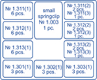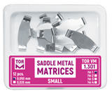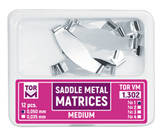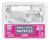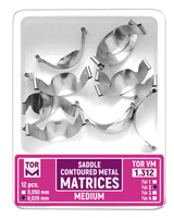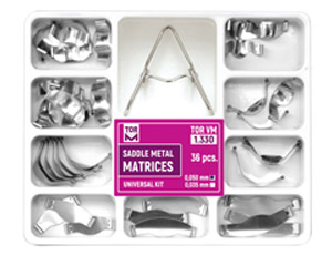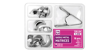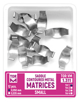 Saddle Metal Matrices.18 pcs.:small № 1.311(1) - 6 pcs., medium № 1.312(1) - 6 pcs., large № 1.313(1) - 6 pcs., small springclip № 1.003 - 1 pc. Matrices are available of two thicknesses - 0,050 mm and 0,035 mm. Specify, please, the necessary type, e.g., 1.310 - 0,035 mm, otherwise you' ll receive matrices of the first type, i.e. 0,050 mm. |