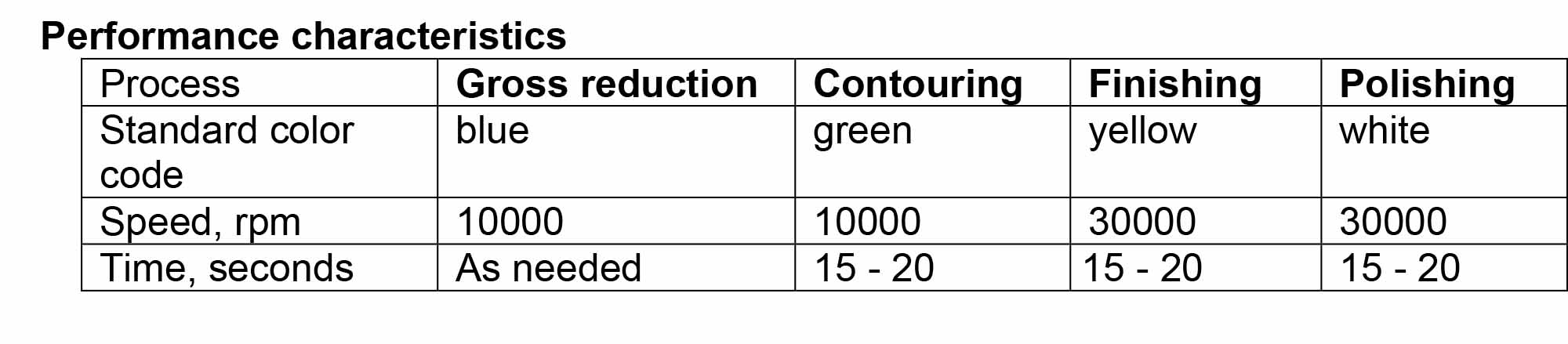 Coated abrasive discs are made by bonding abrasive particles onto a thin polymer backing. The discs are coated with an aluminum oxide abrasive or synthetic diamond powder. Normally 4 grades of discs are used: coarse, medium, fine, superfine. The range of particle size distributions noted for coated abrasive discs vary from 100 to 50 micrometers for coarse-grade discs to 15 to 2 micrometers for superfine grade of polishing discs. The grade of disc is coded with disc color.